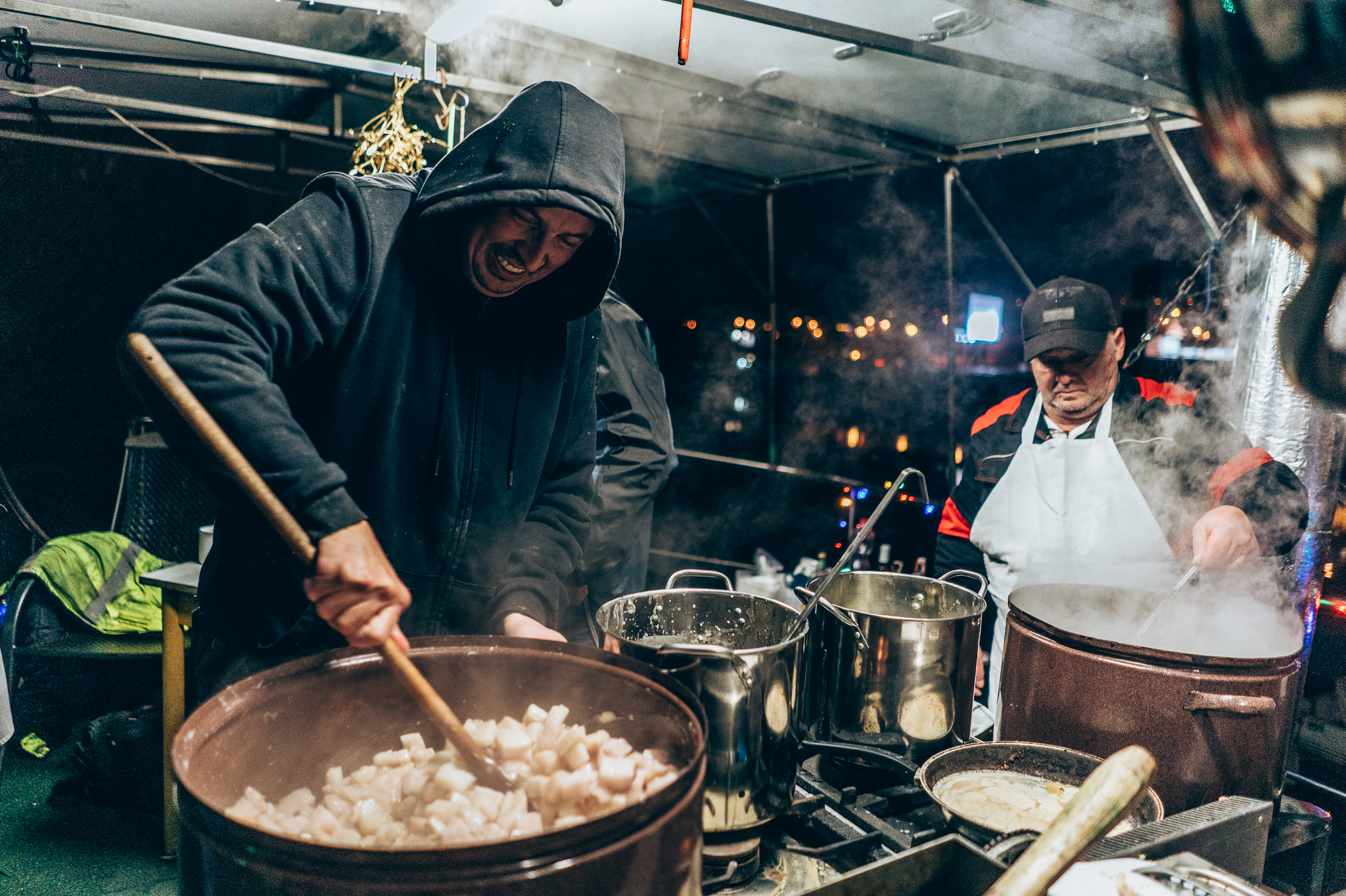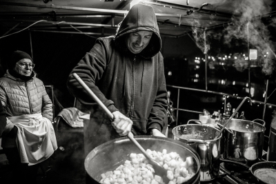 Home pig slaughter is becoming increasingly rare thanks to EU regulations. It used to be primarily a family affair. Nowadays, when few people raise their own pigs, it is becoming more of a community event. This one takes place every year in the Prague marina on Cisarska Louka, which is one of the few places in Prague where people live permanently on boats and houseboats, creating a special community, a village in the city, which to a large extent lives its own life, separate from the surrounding city.